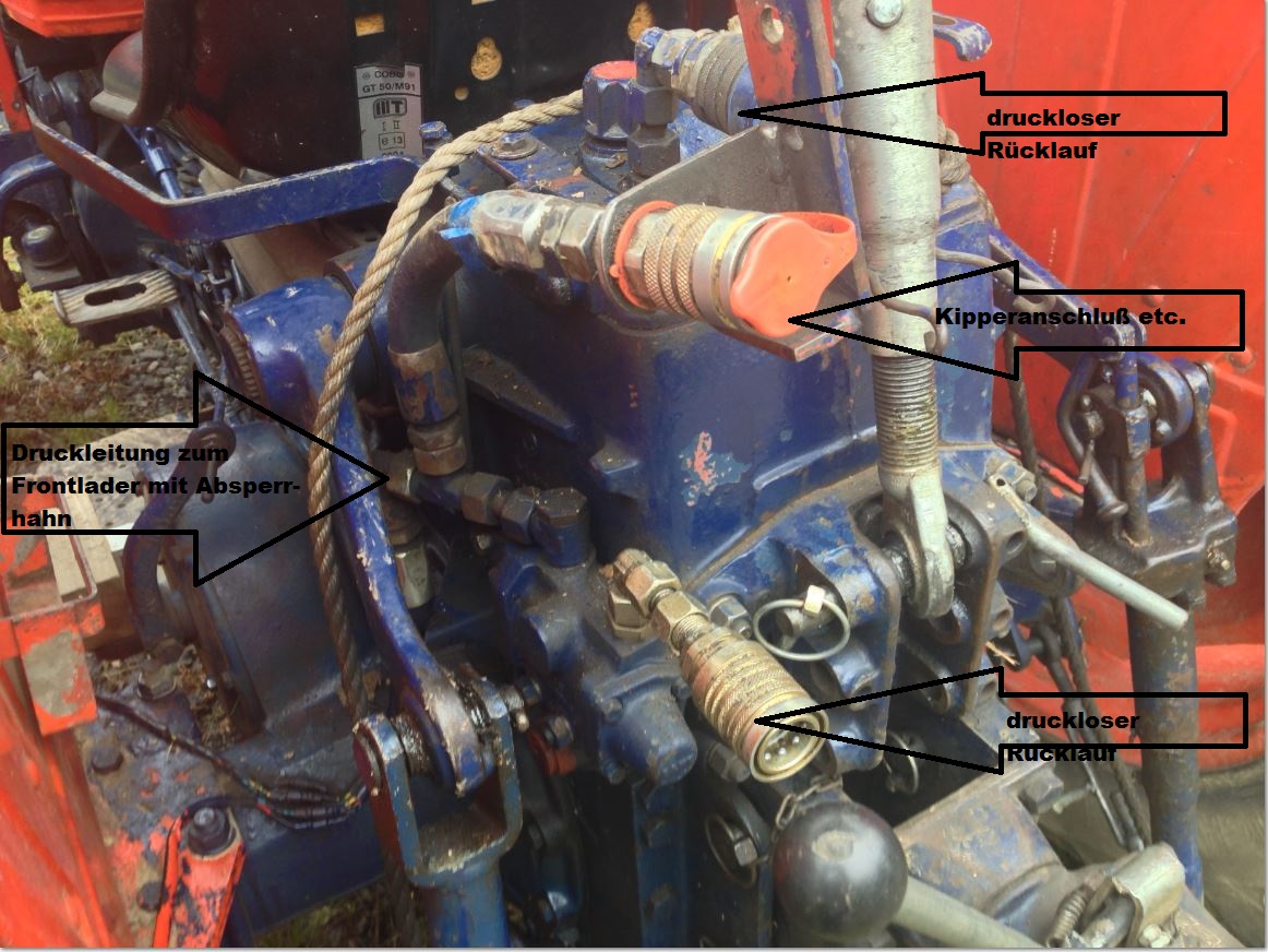 kann es denn sein, dass der Anschluss des Frontladers mit der Leitung zum Kipperanschluss verbunden ist.? Ich hab nämlich das gleiche Problem mit einem Minitauro. Vieleicht kann mir jemand weiterhelfen, da ich nicht weiß, wo ich das Zusatzsteuerventil für den Frontlader anschließen kann.