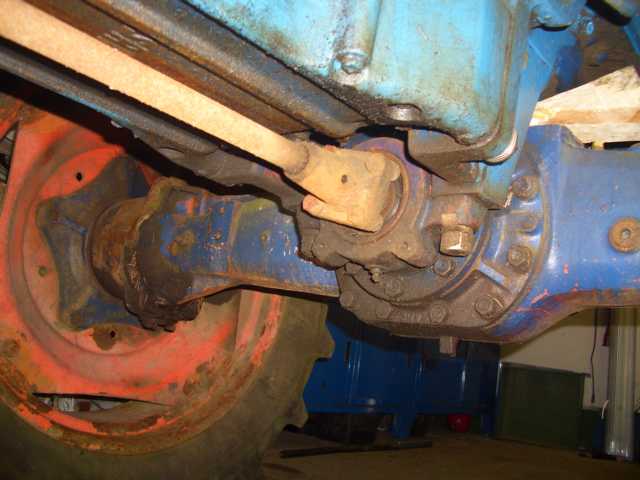 In der Mitte unterm Trecker sitzt ein Lagerbock der auch gelöst werden muss. Unter dem Getriebe ist ein halbrundes Gehäuseteil wo die Welle durchläuft. Dieses Gehäuseteil bleibt dran. Jetzt wird nur noch die gesamte Welle um ca. 1 m nach hinten rausgeschoben. Ich weis nicht, ob aus dem halbrunden Gehäuseteil Öl rauslaufen würde - ich hatte vorher schon Öl abgelassen, wegen Ölwechsel.