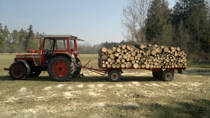Dieses Jahr waren´s viele dicke Bäume, mit der Winde gerückt, mit ner großen Säge abgeschnitten (ob man nun mit ner 3,5PS Säge nen 35cm Stamm oder mit ner 6,7PS Säge nen 60er durchsägt ist nicht viel um), danach mit dem Frontlader aufgeladen und daheim abgekippt oder mit dem Frontlader aufgestapelt. Hast die Brummer nie in der Hand. Eine Kiefer war dabei, die hatte 77cm am Stock, da wirfst 5 Rollen auf den Wagen, dann sieht man was liegen