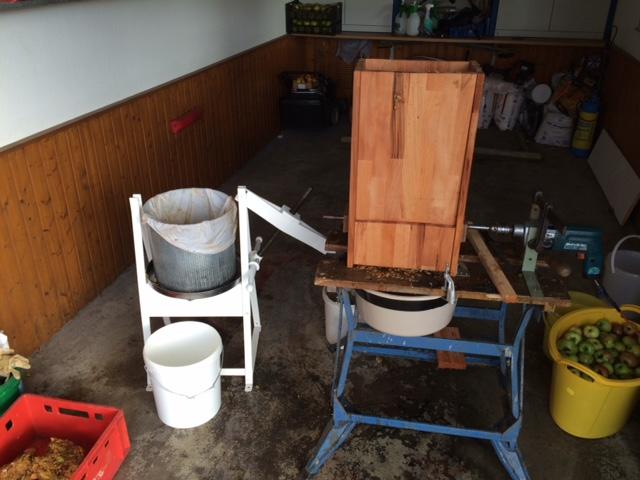 Im Sommer gab es hier unheimlich viele Äpfel. Nachdem wir gut 30 Gläser Apfelmuß eingekocht haben, waren immernoch reichlich da. Ich habe dann einen Obstmuser selbst gebaut (weil so ein einfacher zum kurbeln schon 300€ kosten soll!), eine Spindelpresse ausgeliehen und habe dann nochmal ca 30 Liter Apfelsaft gemacht. Bisschen Ascorbinsäure rein und eingekocht.