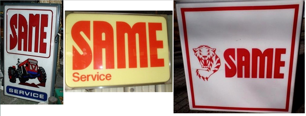 Auf dem linken Bild ist eine Leuchtreklame abgebildet wie sie auch im Februar 1970 außen an der ersten offiziellen deutschen SAME Vertretung in Walldorf / Hessen montiert war.