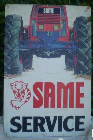Das nachfolgende Blechschild in der Größe 100 x 66 cm stammt vermutlich aus den Achtziger Jahren und dürfte einen SAME Explorer zeigen. Abgebildet ist neben dem SAME Schriftzug wieder der vieräugige Tiger in seiner ersten Variante. Auf Grund des Schriftzuges -SERVICE - dürfte das Schild außerhalb von Italien verwandt worden sein. Das Motiv wurde auch als Plakat eingesetzt.