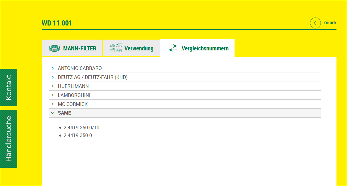 Das von MANN empfohlene Äquivalent für die Same-Deutz-Fahr Teilenummer 2.4419.350.0 ist die MANN Teilenummer WD 11 001.