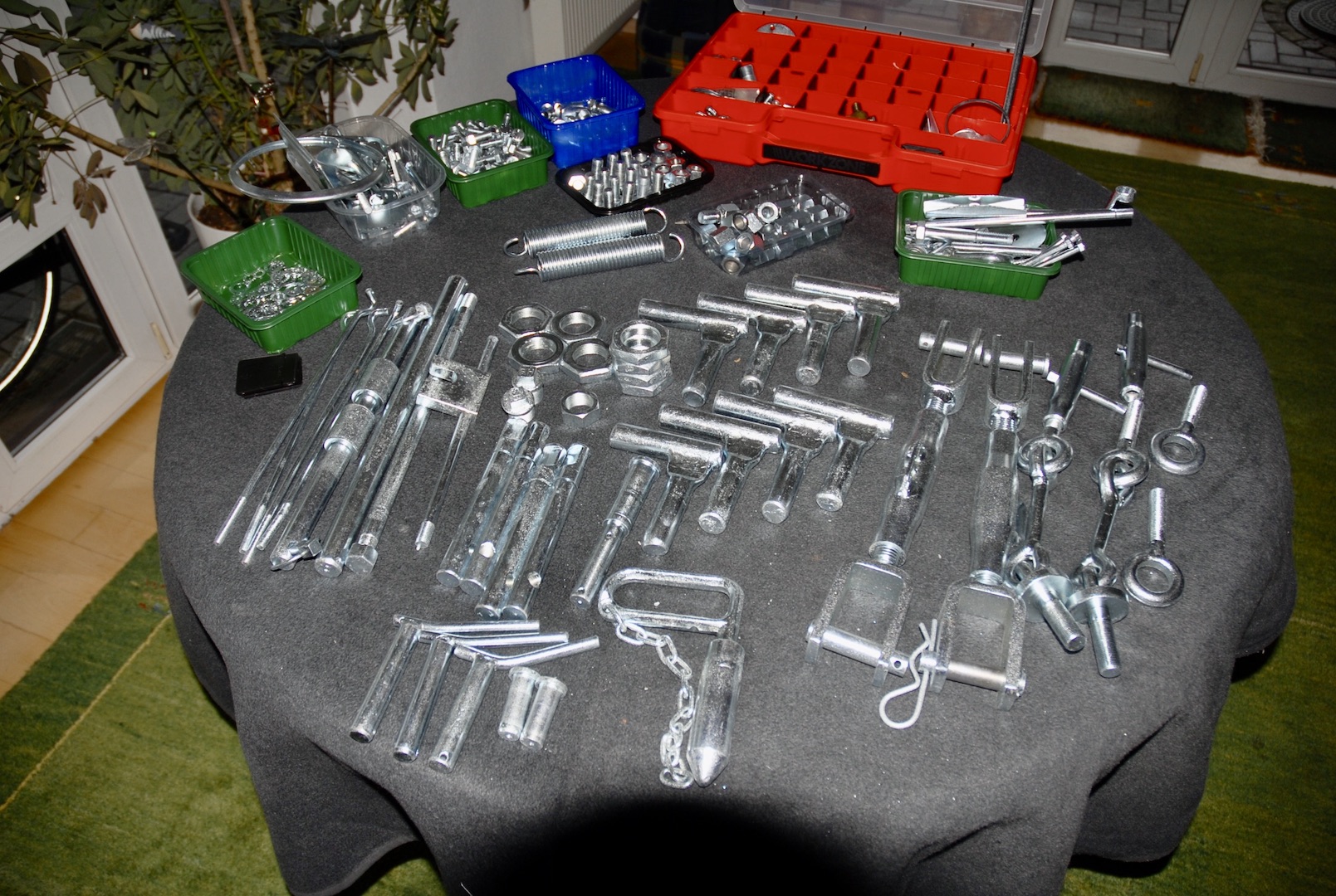 Der größte Teil der bereits aufbereiteten und grundierten Anbauteile sowie die neu verzinkte Schrauben und Kleinteile