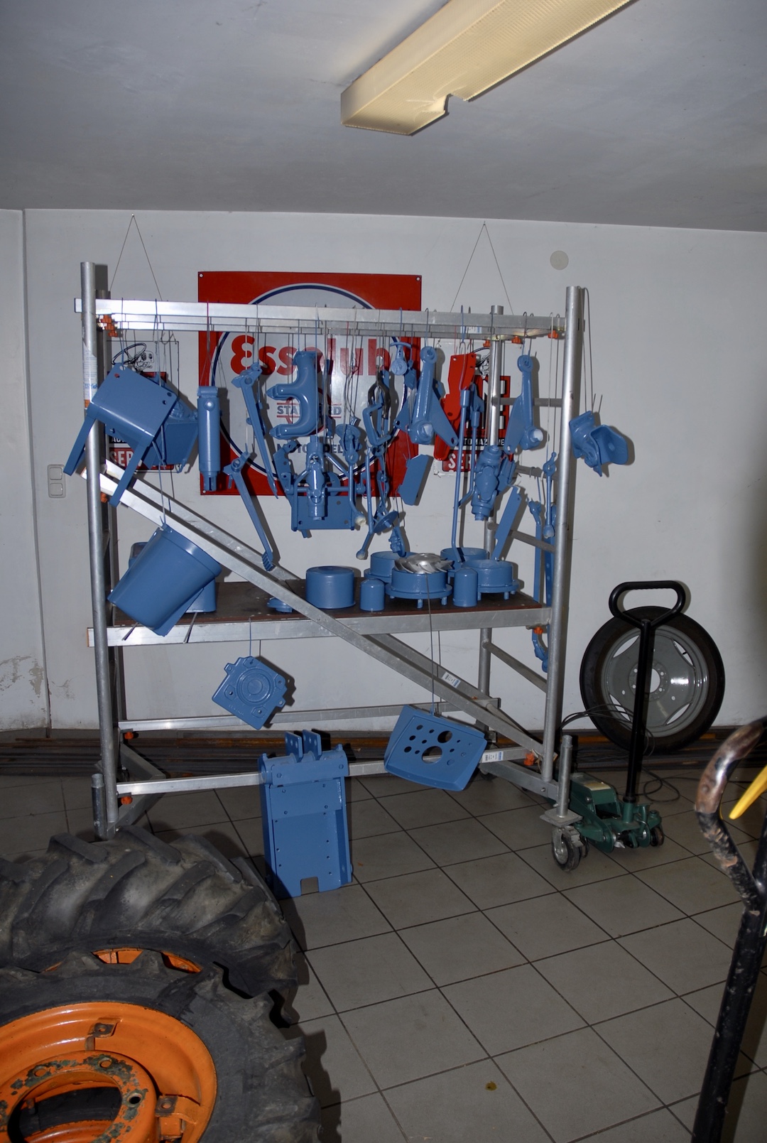 Die abgebauten Teile wurden wurden sukzessive bis aufs blanke Metall saubergeschliffen bzw. gestrahlt und gleich mit Owatrol Kriechöl sowie Brantho Korrux 3 in 1 in RAL 2000 gelborange oder RAL 5007 brillantblau grundiert, um jeglichen neuen Rost zu verhindern.