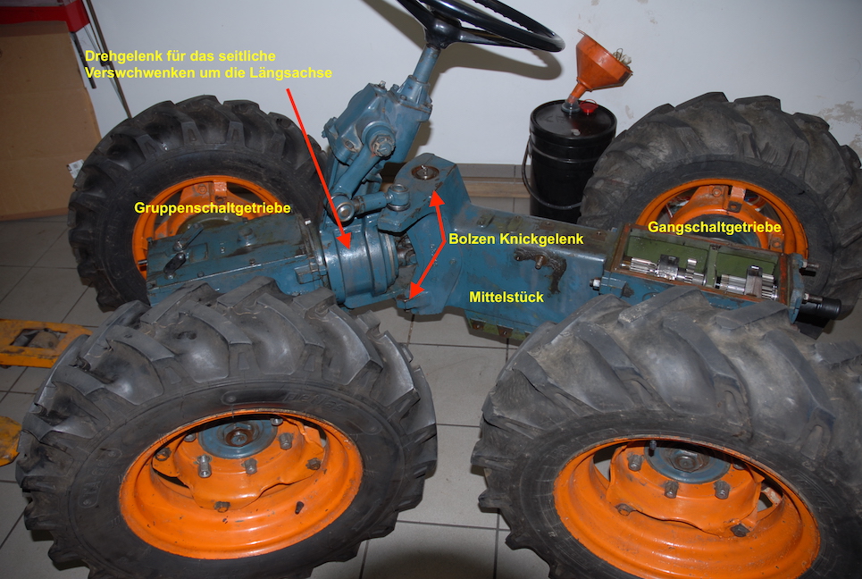 Zusätzlich gibt es hinten am Vorderachsgehäuse noch ein großes Drehgelenk. Damit können die beiden Achsgehäuse sich in der Längsachse zueinander verwinden, ähnlich wie die pendelnd aufgehängte Vorderachse an konventionellen Traktoren.