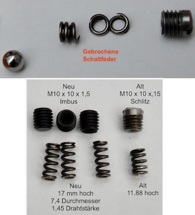 Weil im hinteren Getriebe ebenfalls 2 dieser Schaltfedern verbaut sind, habe ich mir bei einer anschließenden Ersatzteilbestellung auch drei neue Originalfedern und die dazugehörigen Verschlussschrauben bestellt.