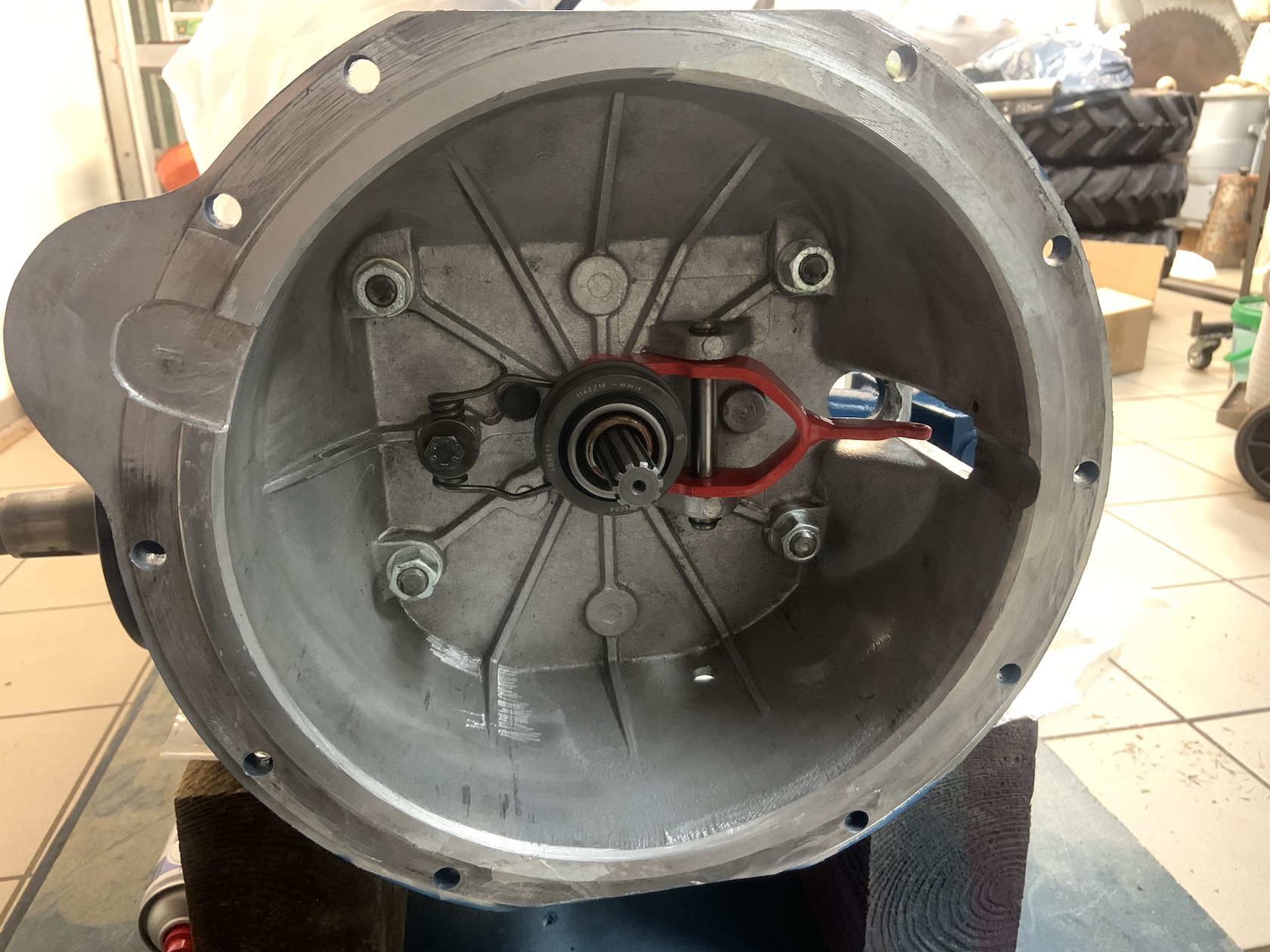 Die Kupplungsglocke aus Aluminium ist mit 4 großen M14 Stehbolzen am vorderen Getriebe befestigt. Zum Getriebe hin ist die Glocke mit einer Papierdichtung abgedichtet, die allerdings vollkommen mit Öl durchtränkt war, was u.a. an den 2 offenen Kugellagern in der Stirnseite des Getriebes liegt.Das Öl in der Kupplungsglocke kam vermutlich über den Simmerring der Getriebewelle, da motorseitig alles trocken war.
