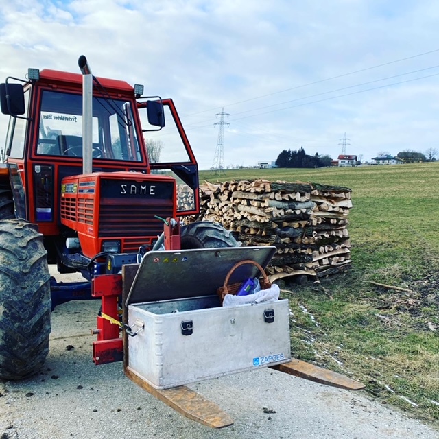 Die Stahlplatte sind erstens mal ca 100kg Ballast und Rammbügel im Wald.