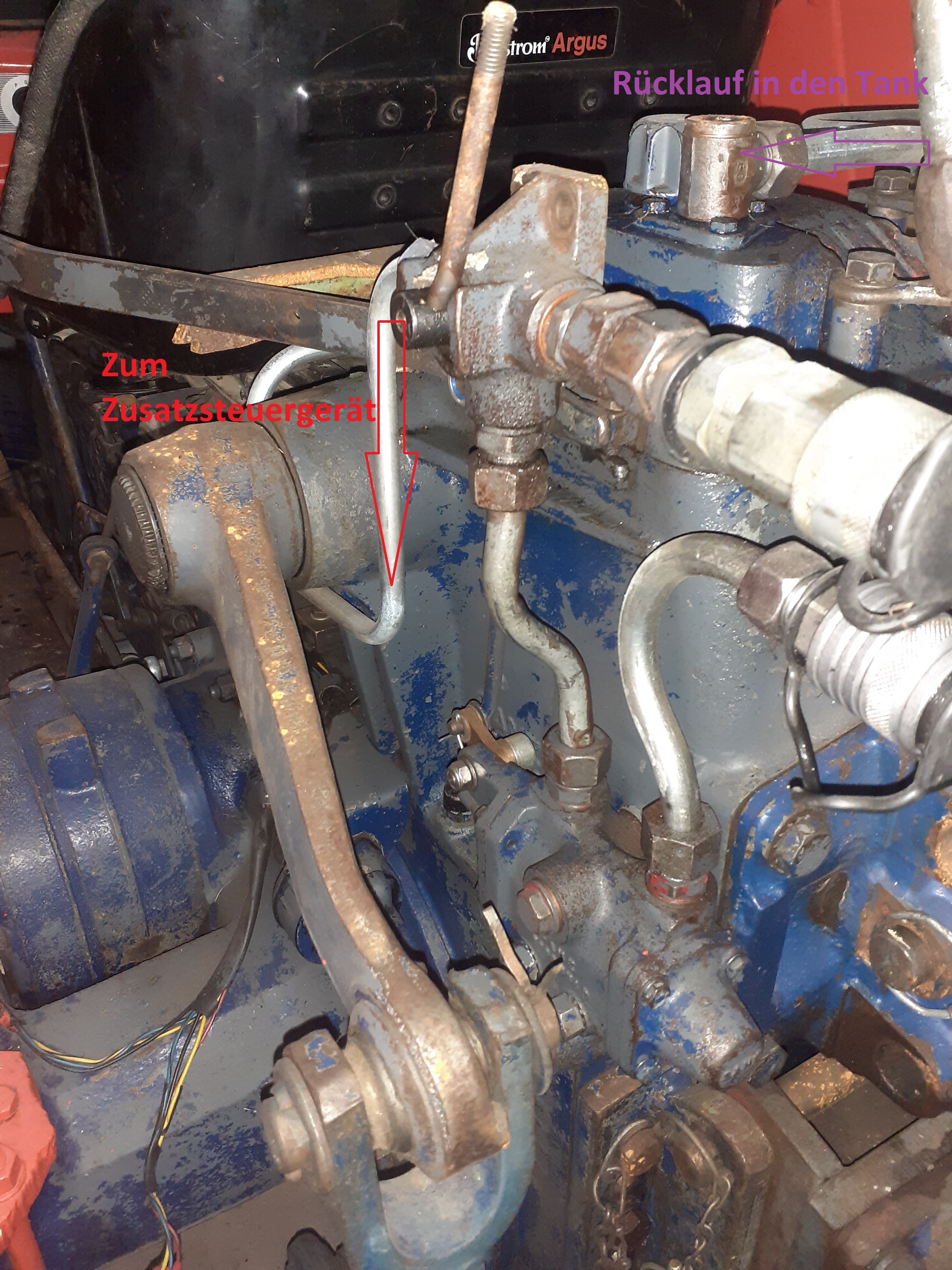 Du hast auf der linken Seite deines Krafthebers ( gesehen von hinten in Fahrtrichtung) zwei Öffnungen im Kraftheber. Die sind im Original mit einem kleinen Gussstück verschlossen bzw. ist dort der Abgang für dein schon vorhandenes Steuergerät ( das müsste dort an den Kraftheber geschraubt sein). Einer der beiden Anschlüsse ist der Vorlauf der andere der Rücklauf.