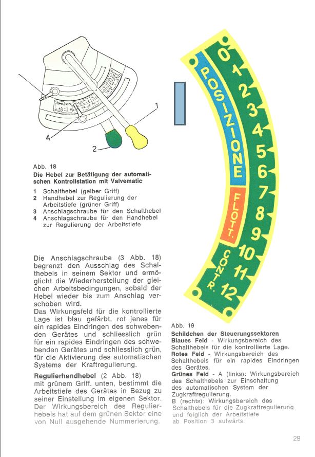 ich habe leider keinerlei Dokumente für den Dorado 66. Ich habe mal aus der BDA vom Saturno 80 ein Bild angehängt. Der grüne Hebel sollte im Bereich "FLOTT" oder "CONTR" sein, dann kannst du mit dem gelben Hebel die Unterlenker entsprechend hoch- und herunterfahren.