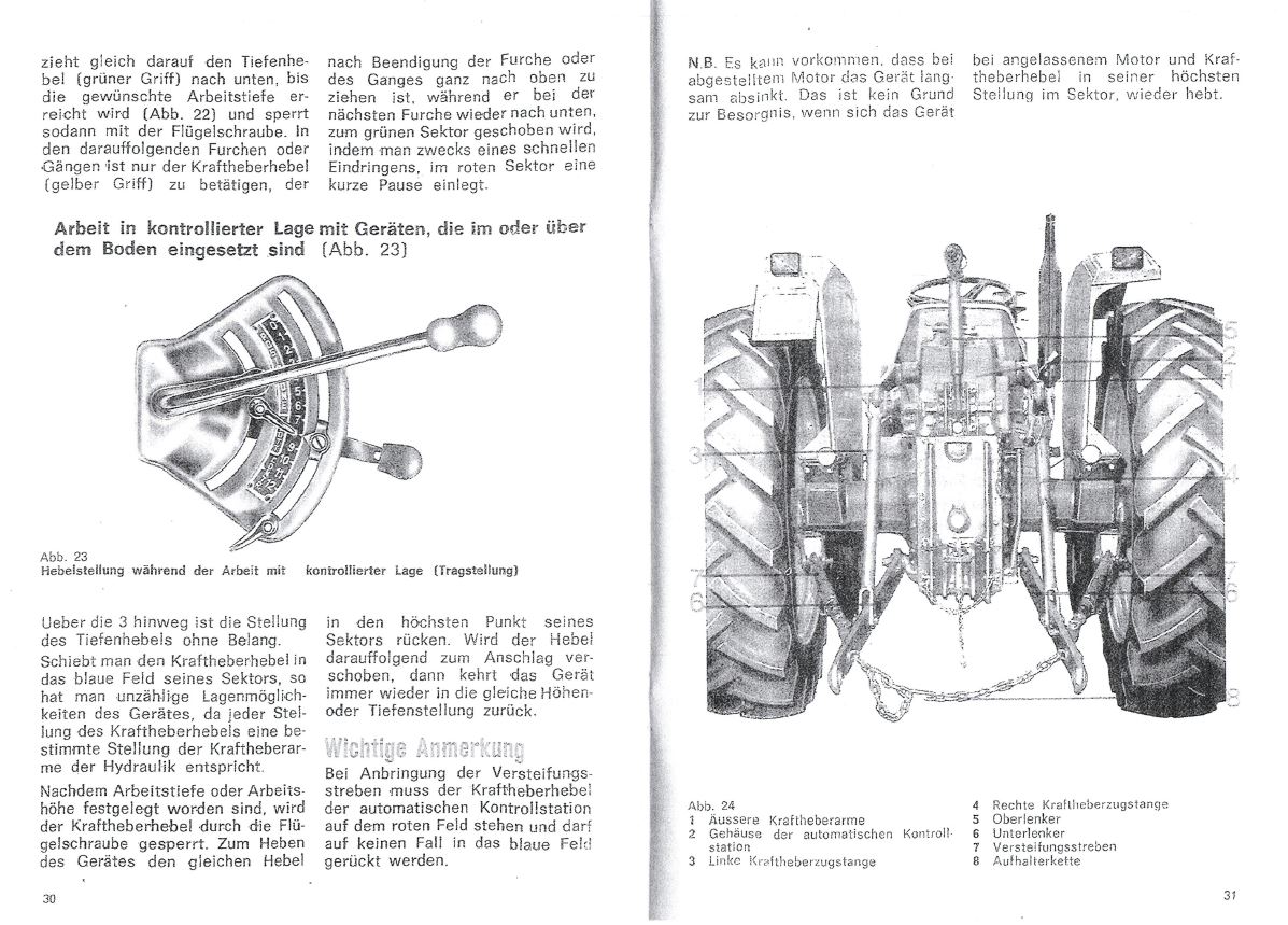 Diesem Bild entnehme ich, daß die Zugkraftregelung die von der Unterlenkerwelle über diverse Gestänge in die SAC übertragen wird, auf dem mittleren vorderen der in deinem Bild weiter oben gezeigten Wellen die das SAC Gehäuse nach außen führt, befestigt wird. Folglich müssen die übrigen Wellen die Funktion des gelben und grünen Hebels unter dem Lenkrad aufnehmen. Ein weiter Beweis dafür ist auch dieses Bild aus der ETL.