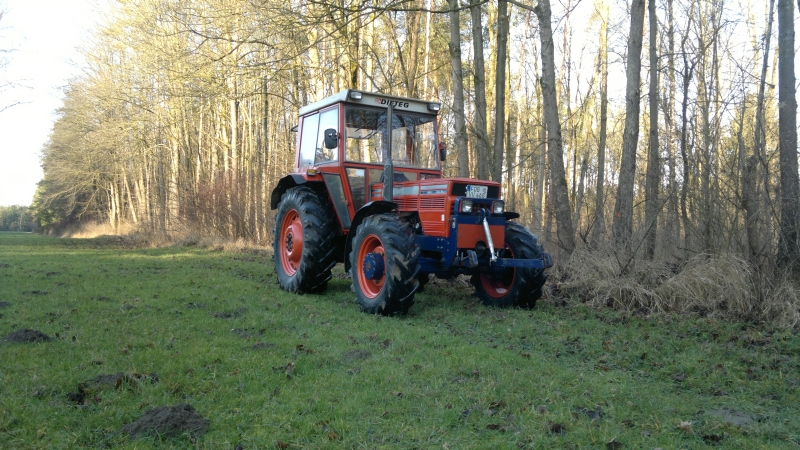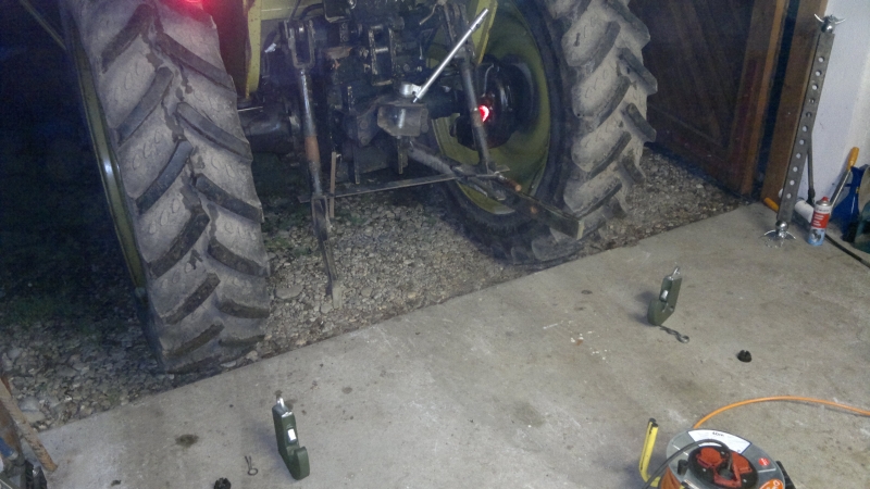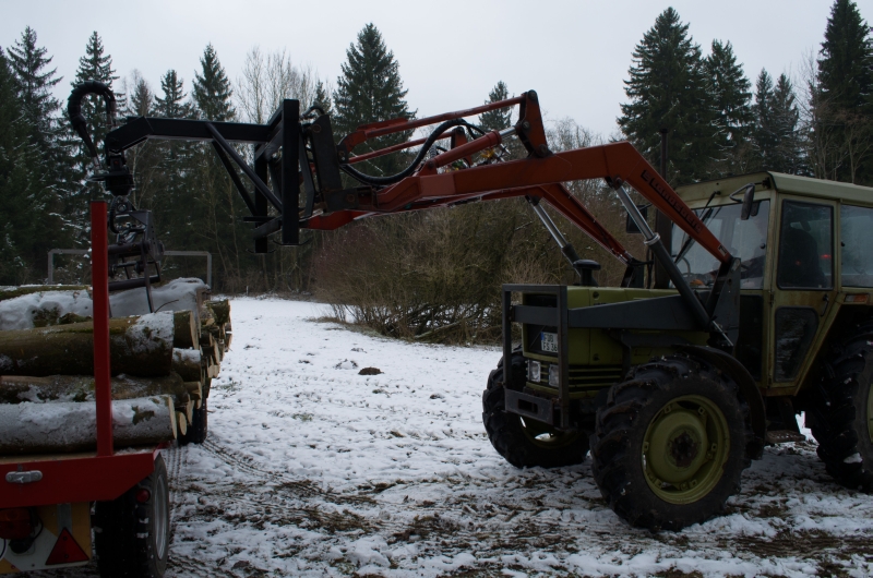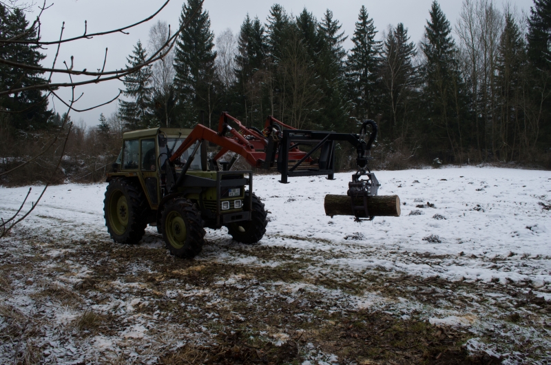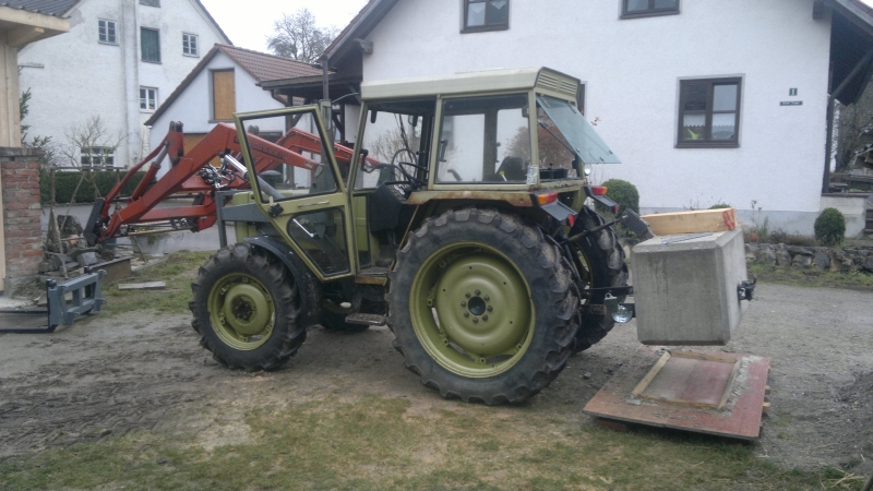 Ich wollt mir eigentlich nen Oberlenkerbock machen, der in die Löcher vom Zugmaul greift, aber das wäre ein so blödes, buckliges Kostrukt geworden, das hätte recht gepfuscht ausgesehen.... Es ist halt das alte Lied, "Für die 3 Mal im Jahr geht das schon"... Zur Zeit hab ich die Winde dran, die zieht auch ganz nett am Oberlenker, aber die Schweizer haben ne ziemlich große Feder eingebaut, da bewegt sich wirklich erstaunlich wenig.... Ich hab auch noch ein kleines Gewicht für den Hürlimann, das hat so um die 400....500 Kg, das ist besser als nichts, aber wenn der Lader mal gefordert ist, ist das eig. zu wenig, da der Hürlimann hinten hoffnungslos leicht ist. Hab ich den Lader dran, ohne was im Heck und trete im Kies auf die Bremse, auch nur leicht, blockiert der sofort.... Zum Mist laden hatte ich heuer nen 800er Klotz von meinem Opa dran, der war auch noch leicht genug. Der Hürlimann ist vorne schwer wie Senkblei, hat die Vorderachse rel. weit innen und einen eig. zu großen Frontlader dran. Der Lader ist nicht besonders lang, hat aber Kraft wie ein Bär, den Hürlimann mit dem kleinen Gewicht dran hebt der hinten aus, ohne dass die Hydraulik Anstalten macht.... Dafür bekommt man den vorne nicht vom Boden, zum Holzrücken ist das schön, wenn man mit 2 Bäumen an der Winde eng um ne Kurve will, mit dem kleinen Deutz auf dem Bild ging´s dann immer grade aus... :mrgreen: