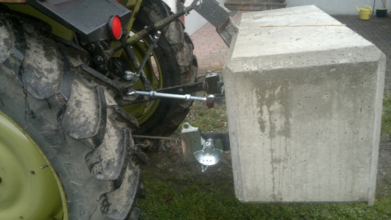 Aber statt der "Gürtel + Hosenträger-Lösung" würde ich dann an deiner Stelle, sofern physikalisch möglich, ganz auf den Oberlenker verzichten und eine verkröpfte Haltevorrichtung oder eine Kette vom oberem Dreipunkt Befestigungspunkt des Heckgewichtes direkt ans Anhängemaul bauen. Die Kette hätte evtl. den Nachteil, das das Gewicht bei starkem Bremsen nach vorne bewegt werden könnte. Inwieweit dann durch die "Kippstellung" des Gewichtes das am Gewicht angebaute Zugmaul noch für einen Anhänger zu benutzen ist, entzieht sich natürlich meiner Kenntnis. Deshalb habe ich an meinem kleinen Deutz D30 nur ein 60 ltr. Faß, damit ich immer noch Anhänger im Traktor Zugmaul anhängen kann trotz des Gewichtes. Mit meinem Same Tiger bin ich bis jetzt immer in der Lage gewesen meinen 2,40m Arbeitsbreite Hammerschlegelmulcher als Heckgewicht nutzen zu können.