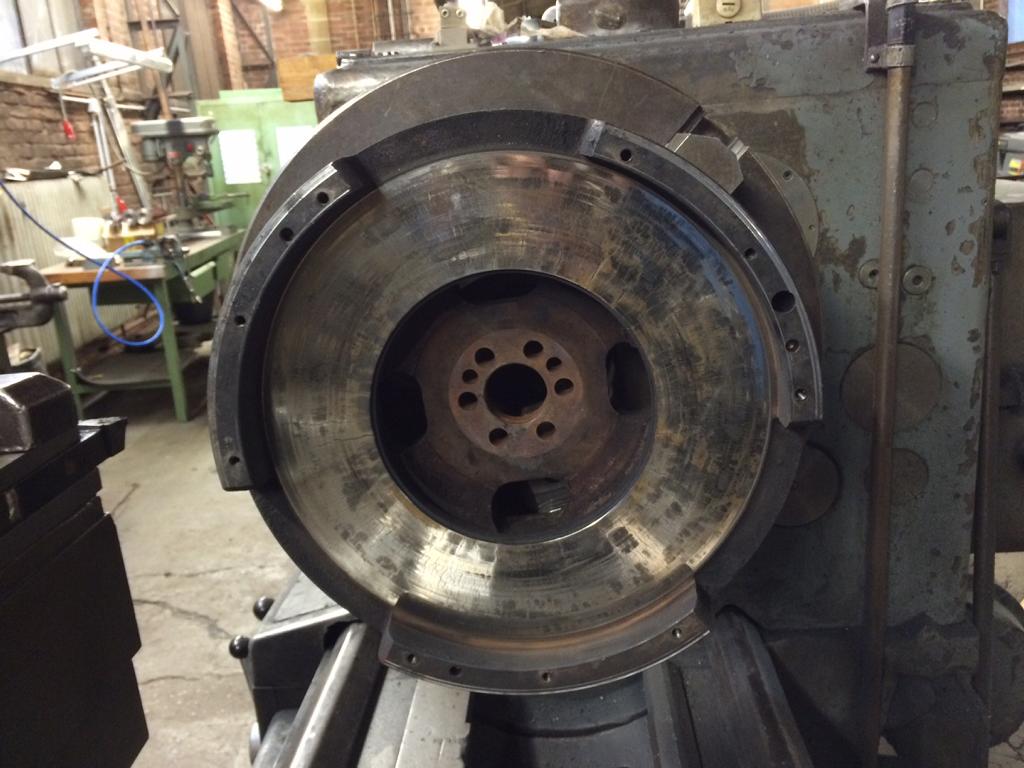 Morgen wird der Schwung abgedreht. Mein Kumpel hat heute schon mit der Messuhr versucht, sie auf der Drehbank auszurichten, hat es aber noch nicht 100%ig hinbekommen. Morgen fahr ich mit ihm und dann gucken wir, dass wir es hinbekommen. Bin mal auf die Maschine gespannt. Man soll bis 1,4m Durchmesser eingespannt bekommen.