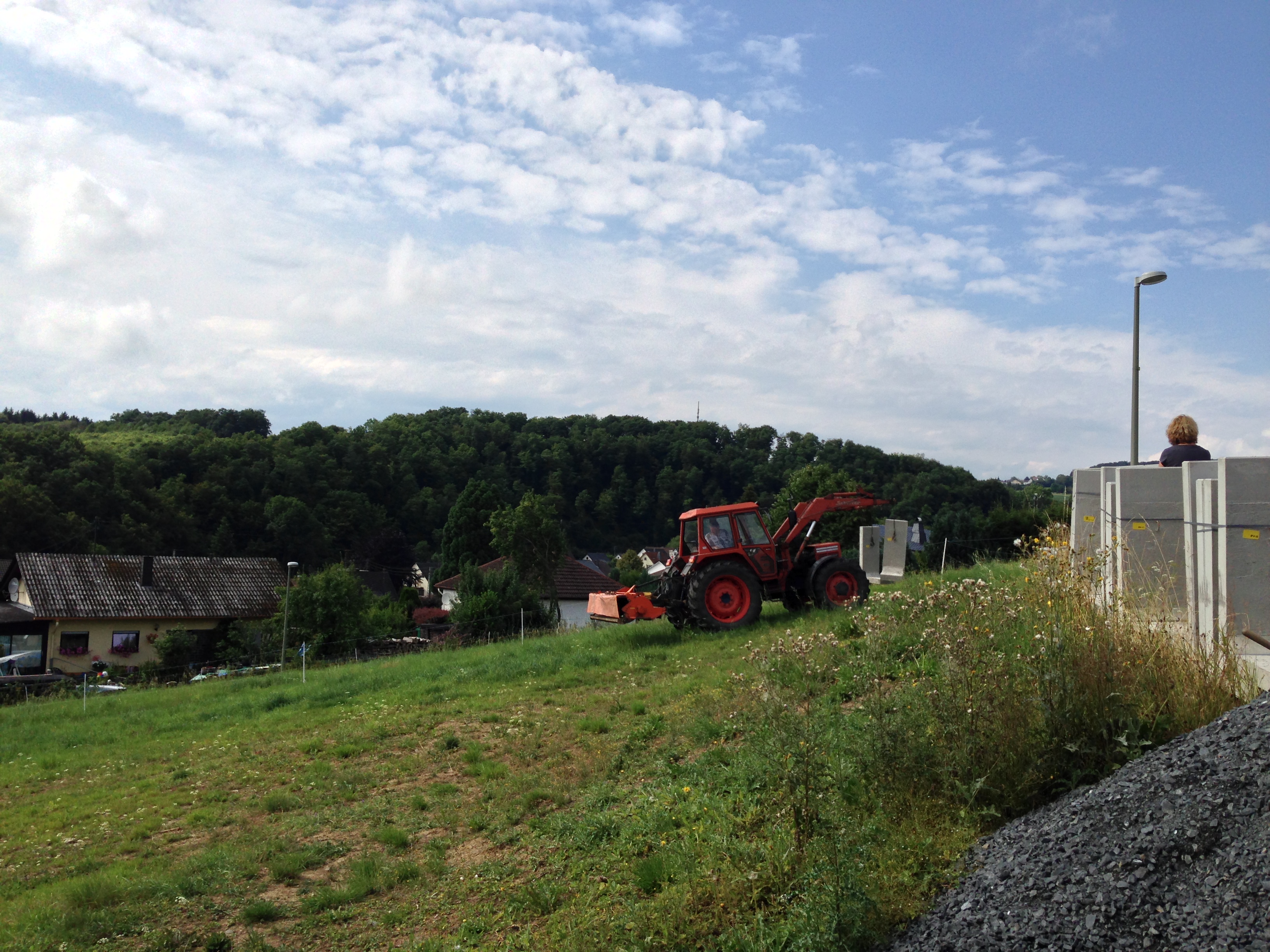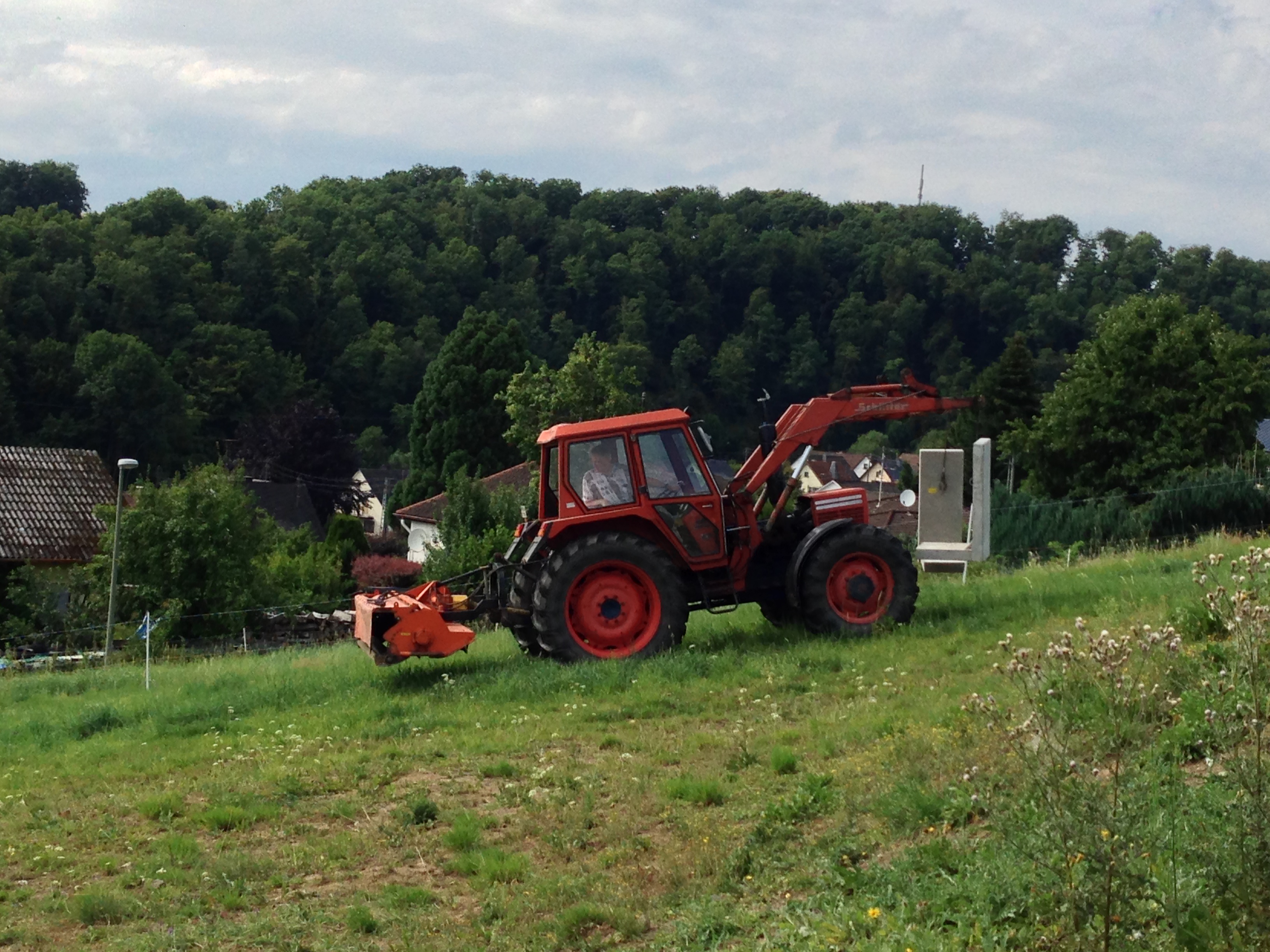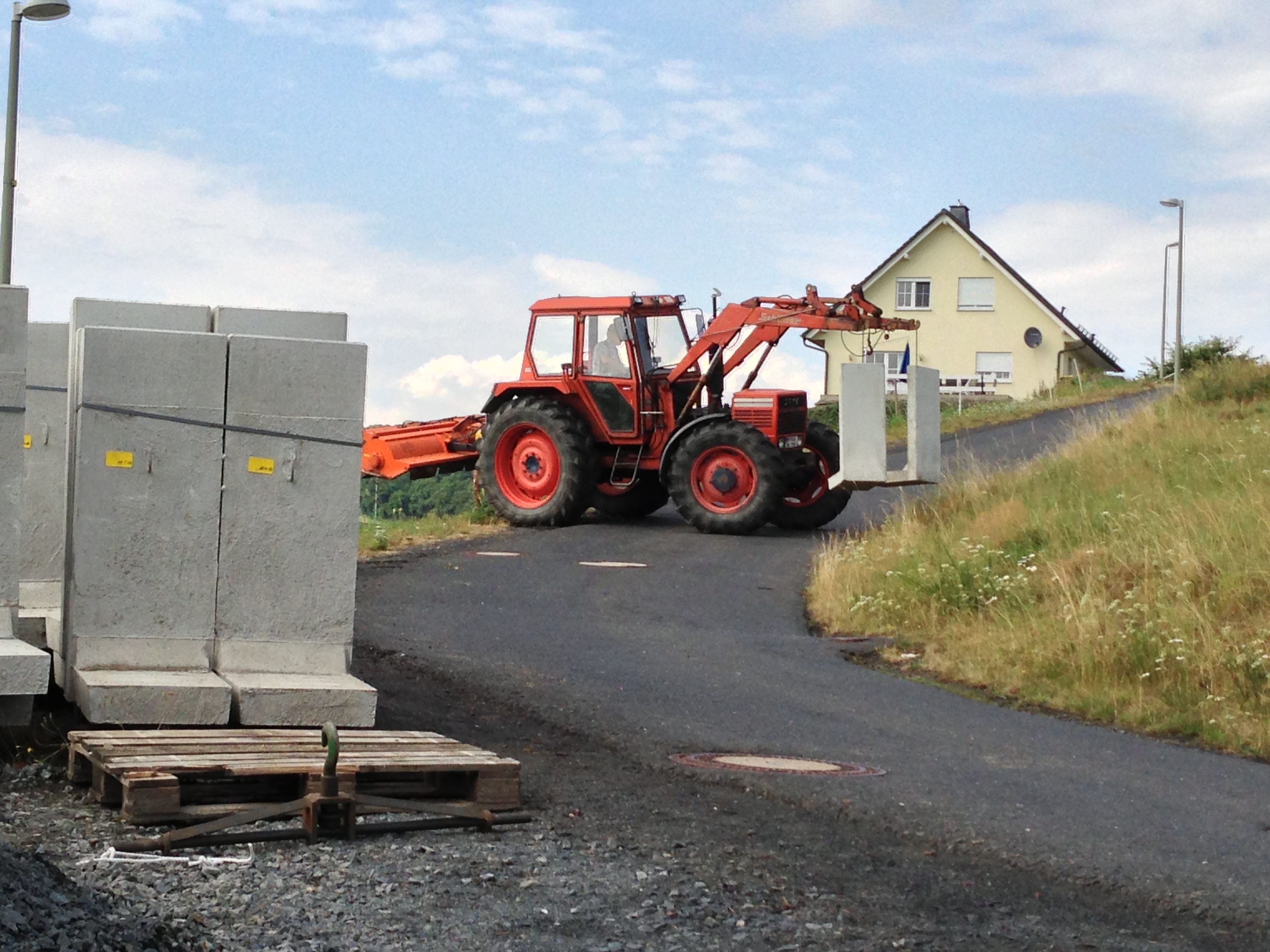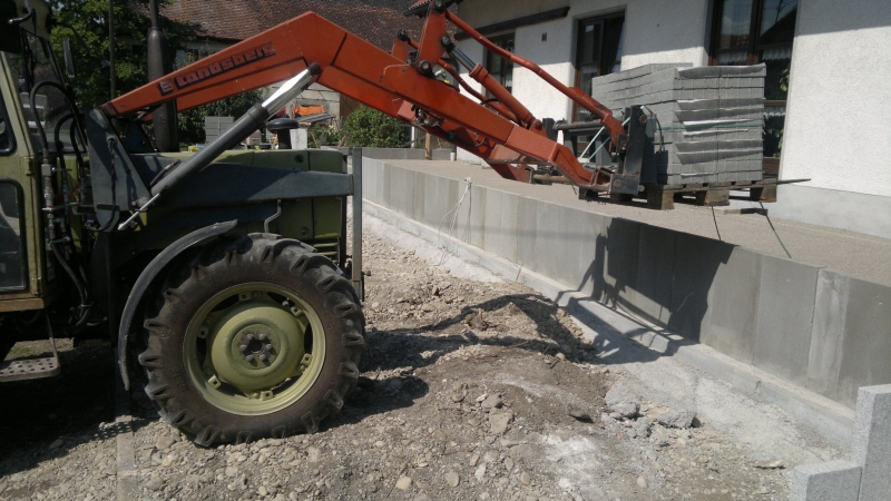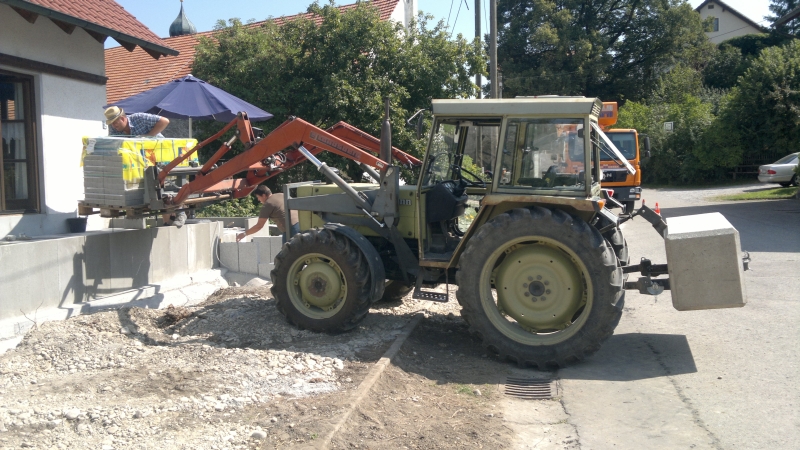 die L-Steine waren das Stichwort. Ich habe mal einem Kumpel ca. 2m hohe L-Steine von der LKW Absetzstelle bis zum Einbauort transportiert und hab tatsächlich ein paar Bilder davon. Aber mehr wie zwei Stück gleichzeitig zu transportieren ging auch nicht und der Hammerschlegelmulcher war ein gutes Heckgewicht.