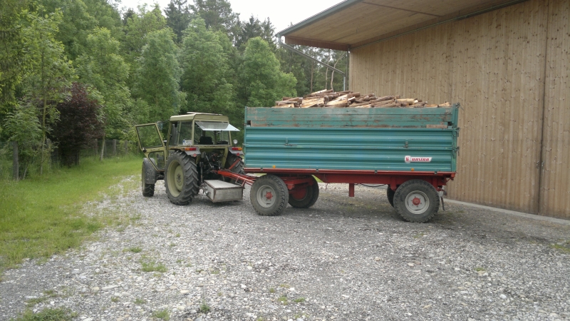 Tatsächlich ist es eher umgekehrt, der Same gurkt mit nem Wagen in der Gegend rum und der Hürlimann muss im Wald durch Gräben, über Stock, Stein und Gebüsch. Vom Motor her muss der Same mehr büffeln, aber der ist auch entsprechend kräftig gebaut, der Hürlimann macht halt seinen Teil mit dem Lader mit und durch das Gewühle mit dem Ding..... Zum Brennholz ausfahren muss der Hürlimann auch herhalten, der geht leichter in die Einfahrten und ist etwas schneller unterwegs.... Haben am Wochenende erst wieder 10Ster auf nen Kipper geladen, dann brennt´s mal wieder den Dreck aus dem Motor, seit der letzten Fahrt ist der Blaudunst doch deutlich weniger geworden und da waren nur 5 Ster drauf. Kann das kleine Hürlimann-Monster da drin mal wieder zeigen, was er kann. Ich werd nur den Eindruck nicht los, dass der mit dem Auspuff nicht so ganz optimal läuft, das obere Rohr ist für meinen Geschmack zu dünn, das bremst nur unnötig die Luft da raus... Müsste man mal was zaubern, am besten aus Edelstahl, aber meine bisherigen Tröten für Kumpels waren meist etwas laut, aber wurden auch von 6 Töpfen und meist nem Turbo befeuert. Der Topf dürfte auch etwas schlanker ausfallen, der Brummer steht mitten im Blickfeld, das eh schon recht klein ist... :? Wenn mir mal ein passendes Rohr zuläuft....