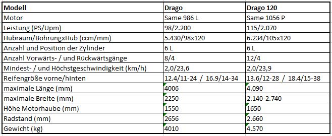 Der Drago 120 ist der erste Traktor von Same, der von einem Motor mit dieser Architektur angetrieben wird. Der Motor wurde mit einem 12+4-Gang-Getriebe gekoppelt, noch ohne Synchronisierung, aber mit einer optionalen Kriechgangschaltung. Als Option war auch eine klimatisierte Kabine auf der Fahrzeugplattform montiert, erhältlich.