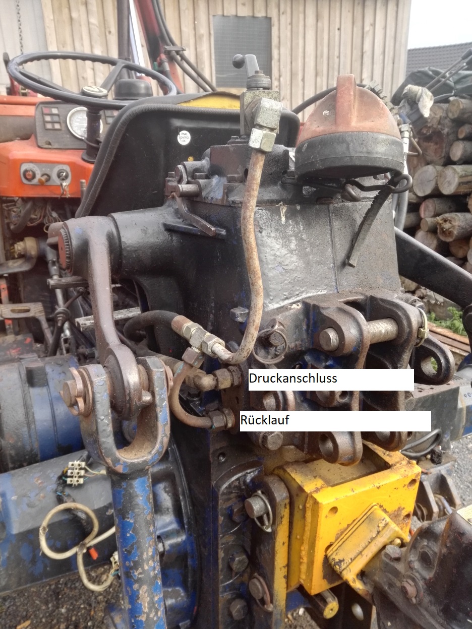 So wie im Bild zu sehen ( oder nicht ) wurde der Druckanschluss am Anschluss in der Mitte abgezweigt. Das ist der Schlauch ohne T-Stück oder sonstiges! Der andre Schlauch mit T Stück ist bei mir der Rücklauf. Steht der Hebel oben so wie im Bild, dann kann ich mit dem Frontlader arbeiten, wird er gesperrt dann kann ich den Kraftheber senken und heben. Leider greift die Höhenregulierung für den Kraftheber bei dem Anschluss aber auch für den Frontlader! - Elegant ist das auf keinen Fall!