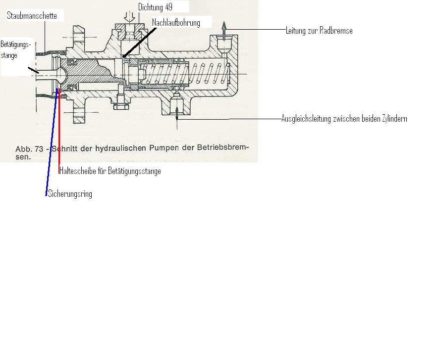 Wenn ich Bremsöl in den Anschluß Leitung zur Radbremse einfülle, so läuft dieses Bremsöl ungehindert durch den Zylinder und durch die Nachlaufbohrung in den Bereich des Zylinders unterhalb der Dichtung 49.