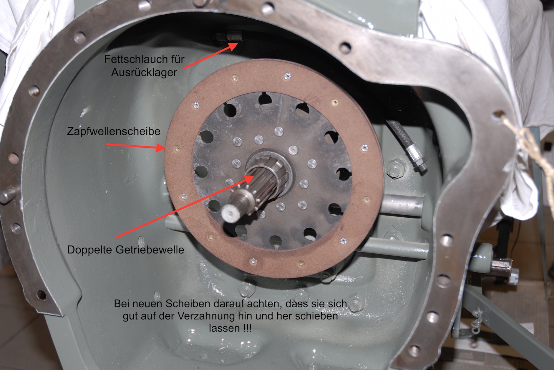 Mein Traktor hat eine Doppelkupplung. Also eine für das Wechselgetriebe zum Fahren und eine für die Zapfwelle. Das Ausrücklager wird über einen Druckschlauch von außen geschmiert. Da der Schlauch schon ziemlich alt war wurde er ersetzt.
