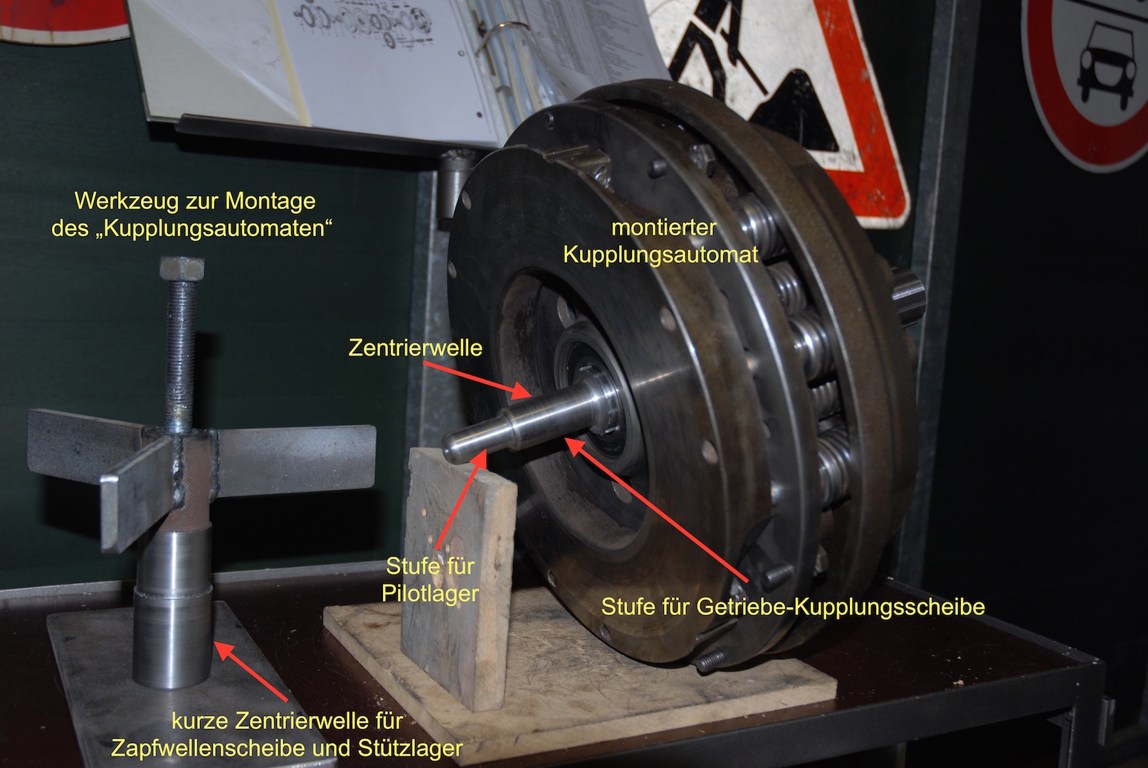 Das erste Werkzeug hat zwei Funktionen. Wichtig ist, dass schon beim Zusammenbau des “Kupplungsautomaten” die Zapfwellenscheibe mit dem davor befindlichen Stützkugellager zentriert wird. Das geschieht mit einem kurzen Stück abgestufter Welle. Gleichzeitig wird eine Vorrichtung gebraucht, mit der die Federn des “Kupplungsautomaten” zwecks Zusamenbau niedergedrückt werden können. SAME hat dafür ein tolles Werkzeug. Mit meinem improvisierten Werkzeug ging es aber auch.