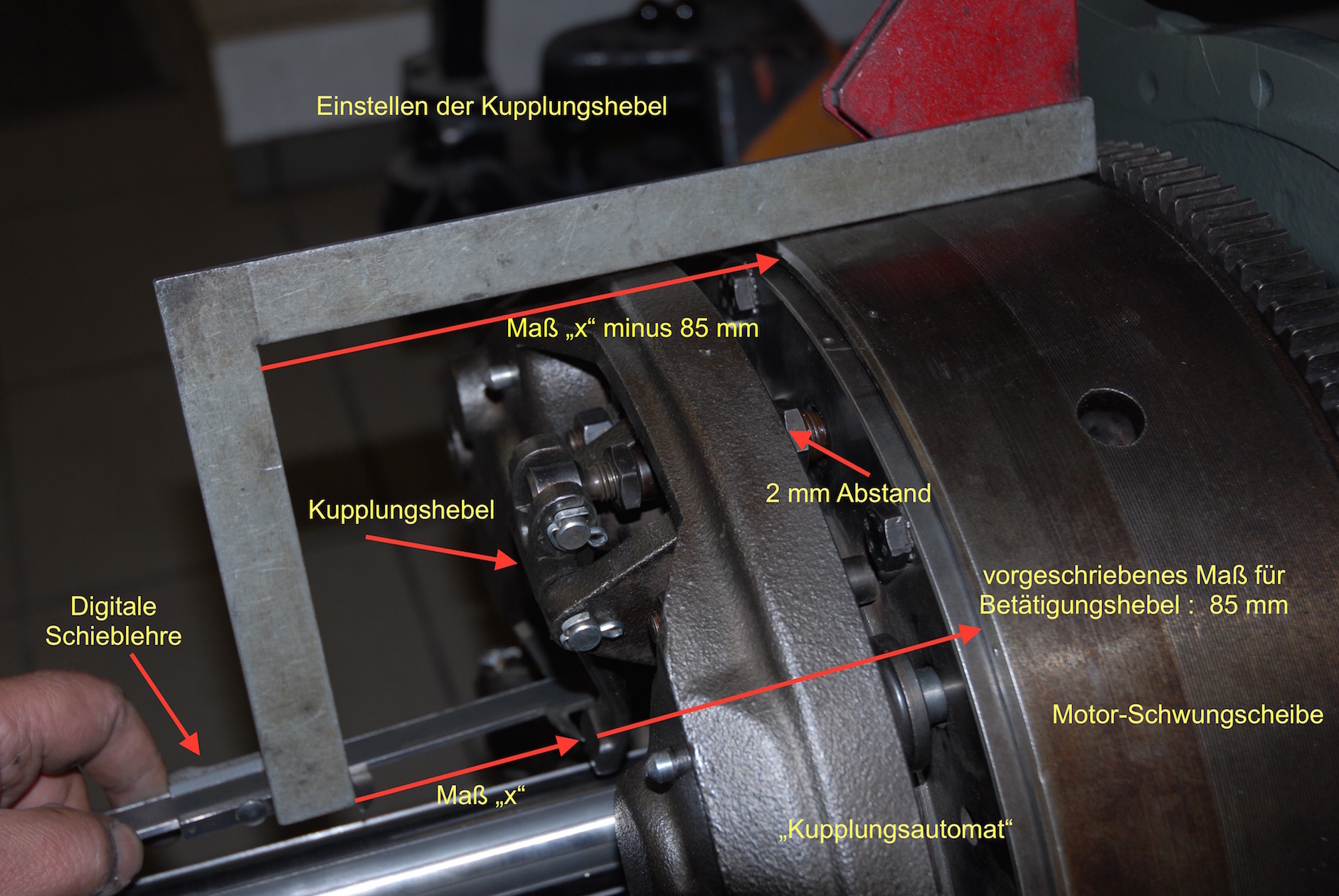 Das dritte Spezial-Werkzeug ist eine Einstelllehre mit der nach dem Anbau des “Kupplungsautomaten” an die Schwungscheibe, der Abstand der Betätigungshebel ( Nr. 7 in der Zeichnung ) eingestellt wird. Für diese Lehre gibt es im Werkstatthandbuch auch wieder eine Zeichnung. Mit einem Eisenwinkel von ca. 30 cm Länge und einer digitalen Schieblehre kann man diese Einstellung