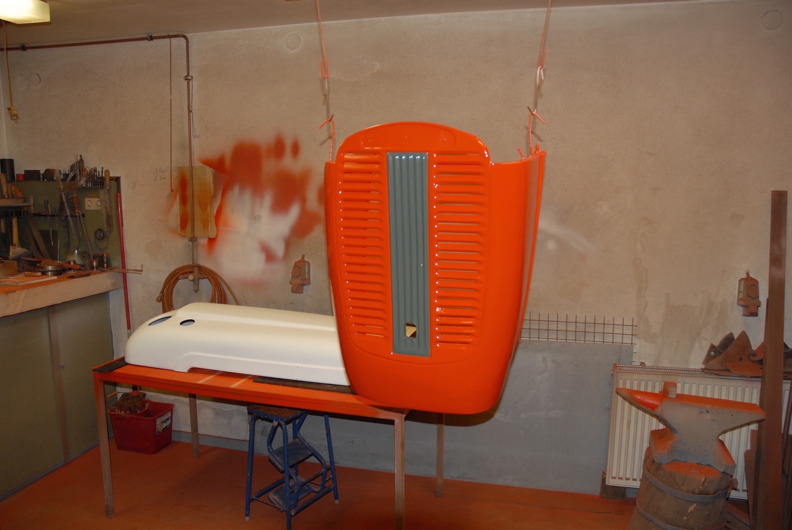 Eine Nachfrage beim Museum in Italien ergab, dass die Blechteile im Farbton Ral 2002 blutorange und das Chassis im Farbton Ral 7009 grüngrau lackiert werden sollen. Italienische Freunde sehen dass etwas anders und haben eigene Farbtöne entwickelt, die den obigen Tönen zwar nahekommen aber doch etwas anders sind.