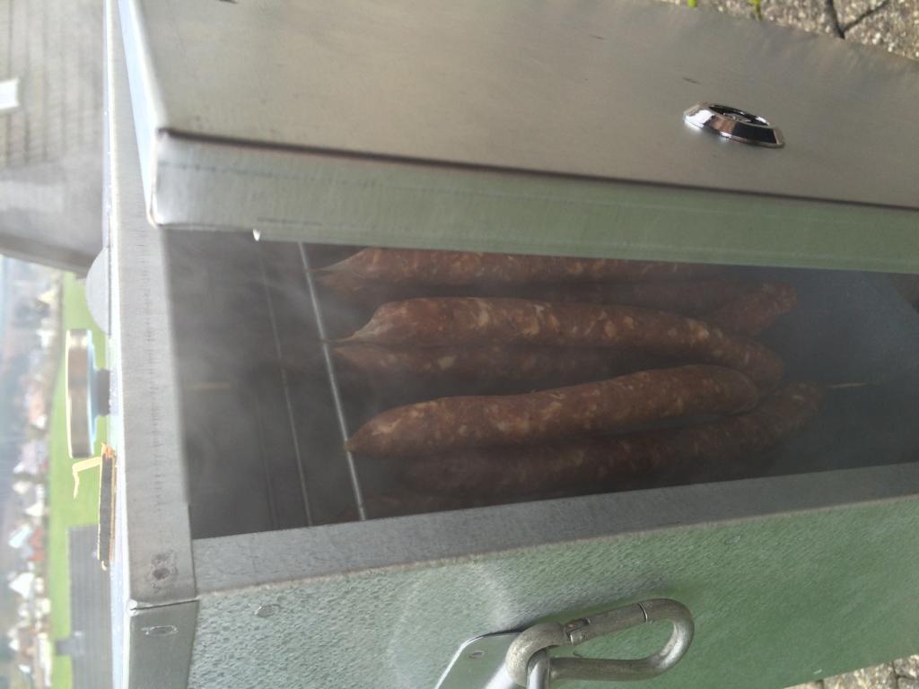 Hatte das Fleisch so in Gulasch-Größe geschnitten, mit den Gewürzen vermengt und über Nacht im Kühlschrank röten lassen. Dann durch die 6er oder 8er Scheibe drehen und in den Darm füllen. Hatte glaube ich Kaliber 20/22. Solange hängen lassen, bis sie äußerlich trocken sind. Danach nach Belieben kalt räuchern. Ich habe 5 mal 4 Stunden geräuchert, morgens um 7 und abends um 9. Dazwischen lüften lassen. Habe mir dazu einen kleinen Jäger-Sparbrand gekauft und von beiden Seiten angezündet. Funktioniert einwandfrei!
