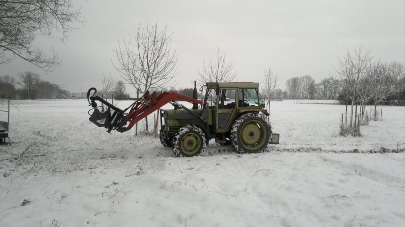 Dieses Jahr waren´s viele dicke Bäume, mit der Winde gerückt, mit ner großen Säge abgeschnitten (ob man nun mit ner 3,5PS Säge nen 35cm Stamm oder mit ner 6,7PS Säge nen 60er durchsägt ist nicht viel um), danach mit dem Frontlader aufgeladen und daheim abgekippt oder mit dem Frontlader aufgestapelt. Hast die Brummer nie in der Hand. Eine Kiefer war dabei, die hatte 77cm am Stock, da wirfst 5 Rollen auf den Wagen, dann sieht man was liegen