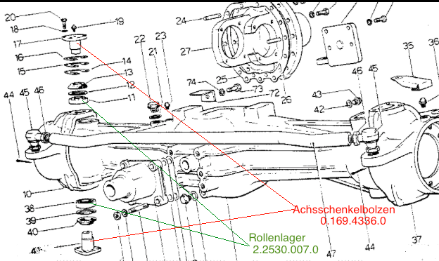 Bei den Nummern 11 und 38 im Bild handelt sich um Rollenlager mit den Abmessungen 30x72x20,75. Beide haben die Ersatzteilnummer 2.2530.007.0. Die Achsschenkelbolzen Nr. 17 und 41 im Bild haben beide die Nummern 0.169.4336.0