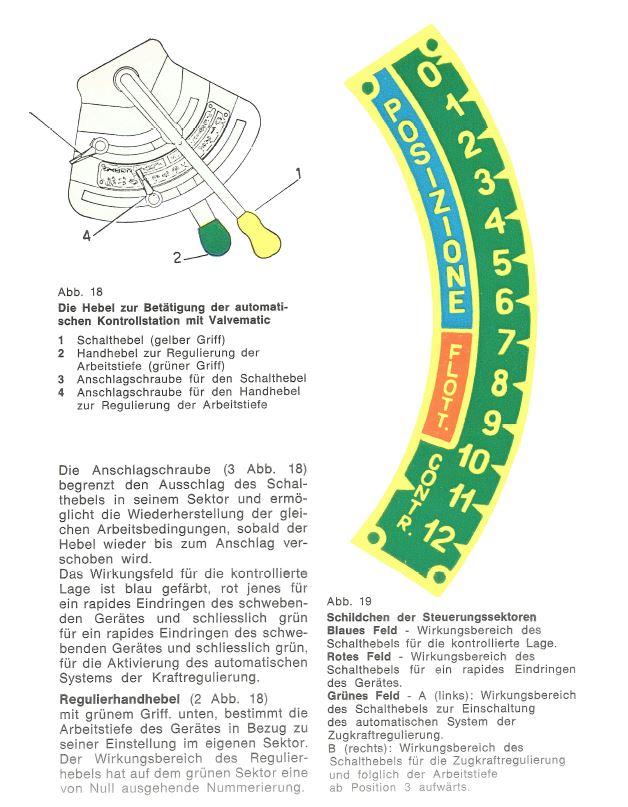 Bewegt man den Langen Hebel im blauen Bereich "Posizione" kann man damit die Lage/Höhe des Hubwerkes kontrollieren und die Stellung
