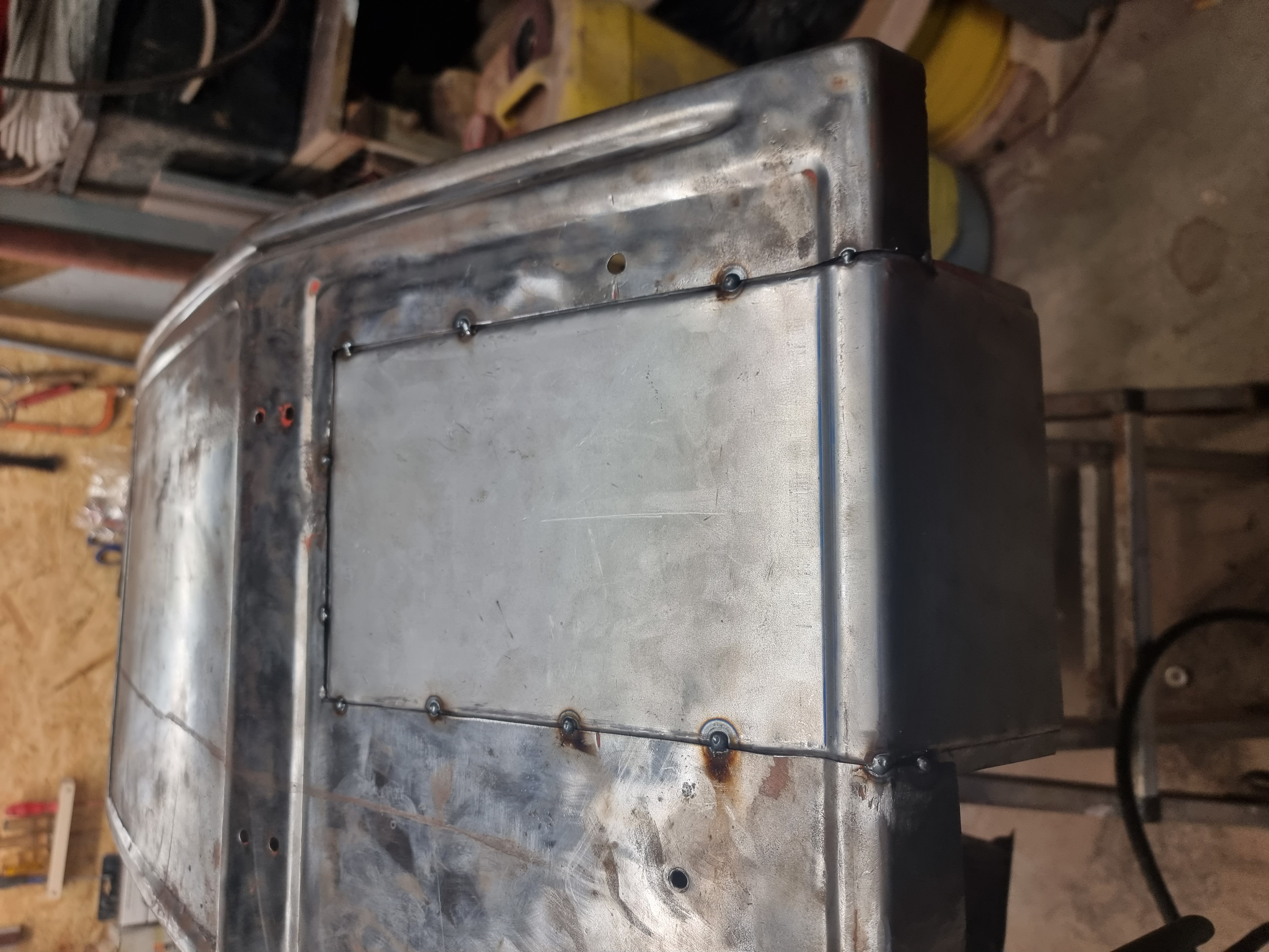 Mittlerweile sind alle Bleche zugeschnitten, abgesetzt und einseitig verschweißt. Anbei ein paar Bilder. Jetzt werden erstmal Ersatzteile für die bremsen besorgt.