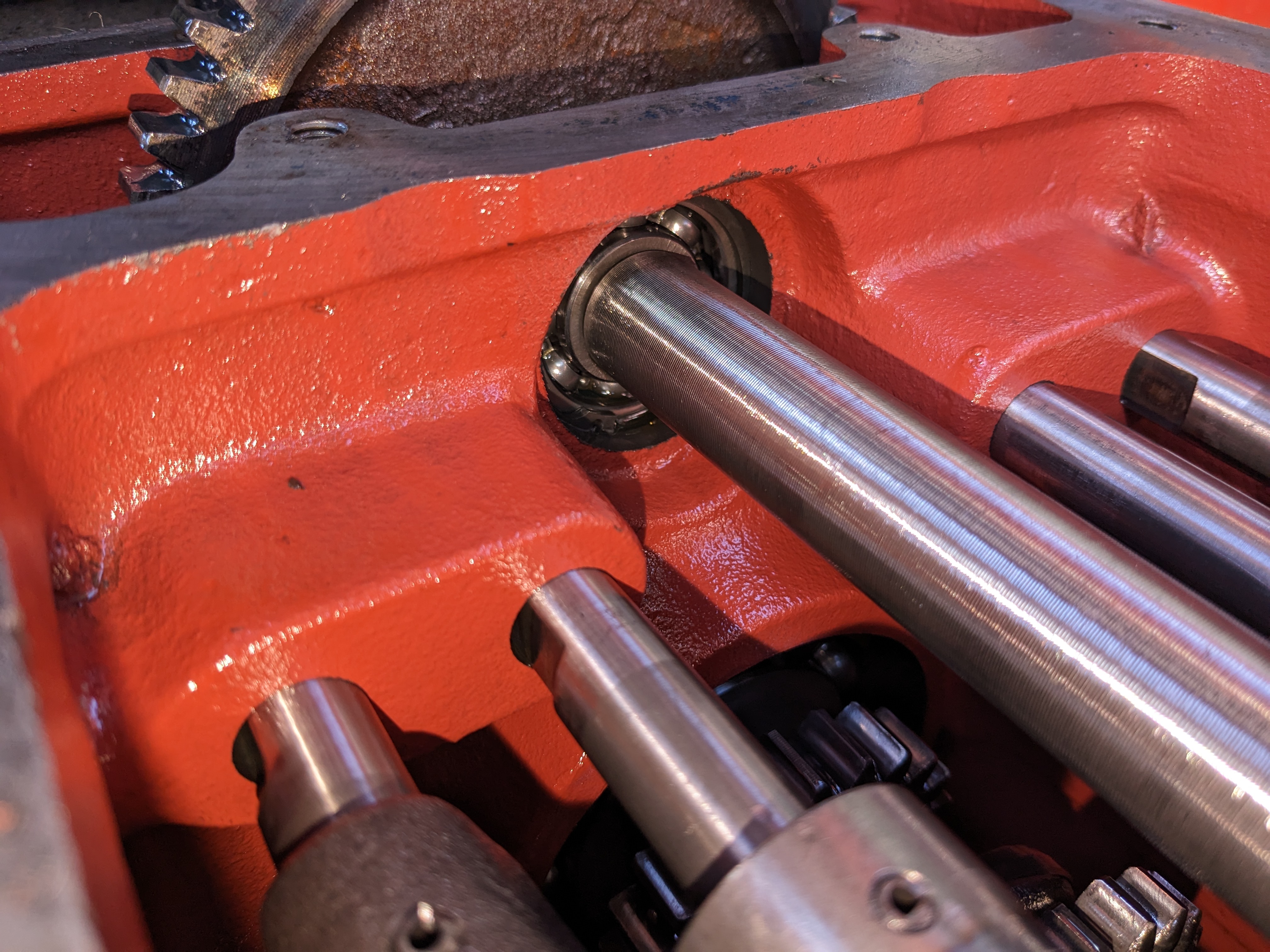 I opened the gearbox since my PTO lever wasn't aligned properly, going into gear in some random place and the PTO was slipping out of gear under load. I loosened the lever, pulled it out of the gearbox to disengage from the gear selector sleeve/muff and moved the lever/sleeve back and forth until they lined up correctly (by feel and spinning the PTO by hand). It now hits both gears and spins freely in the middle.