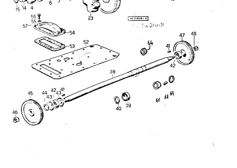Als ich versuchte, den Zapfwellenhebel an meinem Falcon 50 zu reparieren, öffnete ich das Getriebe und fand einen losen Sicherungsring an der Achse, die die Hydraulikpumpe antreibt. Ich denke, es ist Teil 40 (2.1419.004.1) auf der beigefügten Teilezeichnung und soll vor dem Lager hinten sitzen? Vorne ist bereits ein Ring.