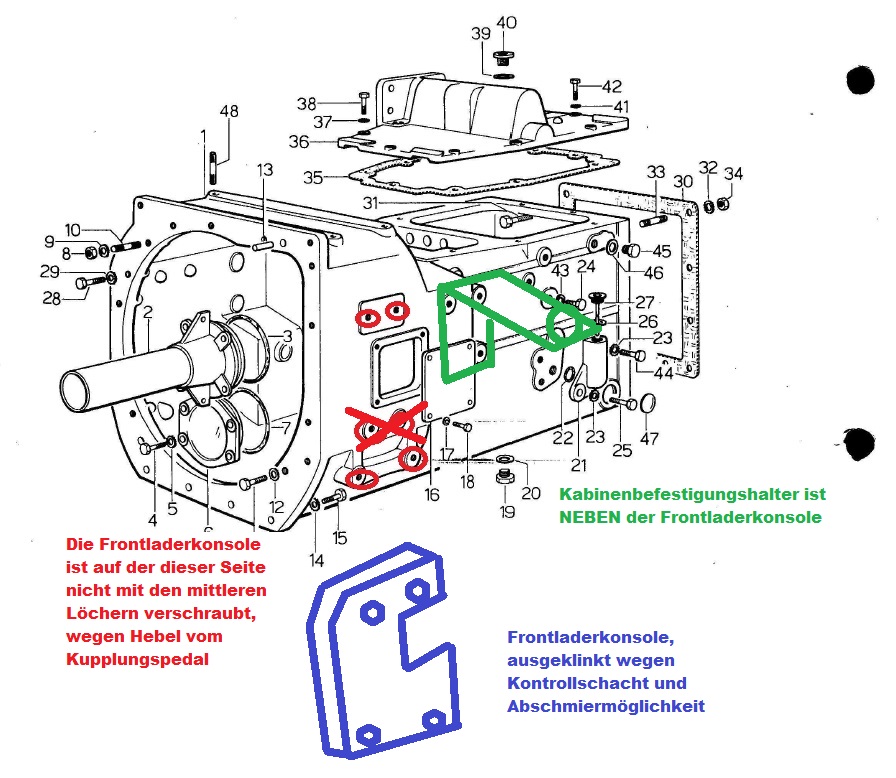 die alte Konsole hat eine Traverse über die Motorhaube aber die gesamte Konsole muß ich umändern. das einzige was paßt sind die Frontladeraufnahmen jetzt muß ich nur eine Konsole für die beiden Frontladeraufnahmen mit dem genauen Abstand unten am Getriebeblock herstellen. Bei meinem Getriebe sind auf der unterseite am Getriebe 2 bzw. an der seite 3Löcher frei ( außer ich nehme die 3 und zusätzlich noch die 2 wo die Kabine befestigt ist) kannst Du mir evtl.sagen was die bessere Lösung wär, das ist bei deinen Bildern nicht ganz ersichtlich. Ich nehme für die Konsole einen Flachstahl 20mm x 140mm. Was ich bei deinen Bildern gesehen habe ist das Du nur 2 Schrauben am Vorderteil des Motors bzw. Achse hast, reicht das aus?