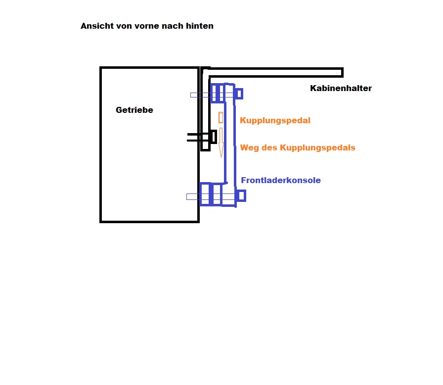 Das mit dem Kupplungsgestänge sollte auch passen. Ich habe bei mir den Wartungsdeckel für die Kupplung entfernt. Das Loch wird jetzt von dem 20mm Flacheisen der Frontladerkonsole abgedeckt. Das 20mm Eisen geht soeben zwischen Gehäuse und Gestänge. Die Schrauben habe ich im Flacheisen versenkt. Also zuerst ein normales 16,5er Loch gebohrt und dann die oberen 15mm auf 30mm aufgebohrt, sodass die Schraubenköpfe versenkt sind.