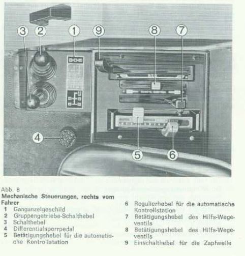 Hier ist das Steuergerät im Deckel der Automatischen Kontrollstation eingebaut und die Bedienhebel befinden sich rechts neben dem Sitz zwischen den Bedienhebel der Heckhydraulik (gelber und grüner Knopf) und dem Bedienhebel für die Zapfwelle (schwarzer Knopf) und sind auch ausgestattet mit jeweils einem schwarzen Knopf.