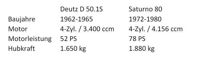 Hier eine kurze Gegenüberstellung: Ja das ist nicht gerade 1:1 vergleichbar. Der Deutz hat ca. 12 % weniger Hubkraft und nur 2/3 der PS-Leistung des Saturno.