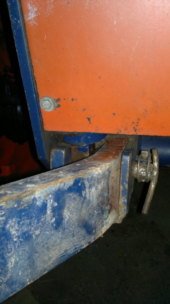 Hier kann man den Bolzen sehen, der die FH zusammenhält. Er verbindet den Hubzylinder mit dem Unterlenker und dem Verbindungsrahmen der beiden Unterlenker. Das ist aber bei jedem Modell anders, meistens sind die Unterlenker mit einem extra Bolzen am Rahmen zwischen den Zylindern befestigt.