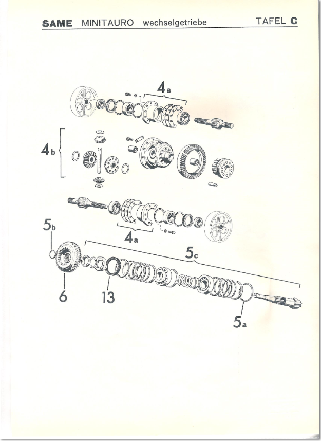 Um eine erste Bestandesaufnahme zu machen reicht es das Hubwerksgehäuse kompl. abzubauen ( ist eine eigenständige Einheit nur rundherum die Schrauben lösen, die hinten in der mitte von unten nicht vergessen, Gestänge abhängen und zu zweit runterheben ) das Getriebeöl abzulassen, eventuell noch den Blechdeckel vor dem Hubwerksgehäuse, dann siehst du das Diff und genau darunter befindet sich die Schaltmuffe. Danach lässt sich die Zapfwelle nach Demontage des Seegers hinten kompl. mit der Lagerung nach hinten rausklopfen. Leider weiss ich nicht mehr ob die Schaltmuffe so ausgebaut werden kann oder ob sie am Diff ansteht, mein letztes Taurusgetriebe war vor ca. 20 Jahren. Falls nicht oder falls es nötig wird die vordere Welle auszubauen muss der Traktor getrennt werden um die Befestigungsmutter der vorderen Welle zu lösen damit diese danach auch nach hinten rausgetrieben werden kann.