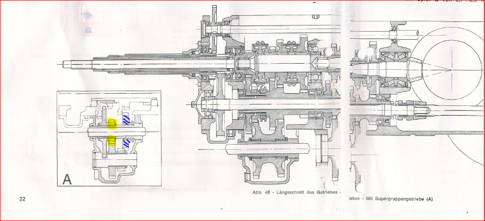 Dieses Bild stellt einen Längsschnitt (linke Bildseite ist motorseitig) des Getriebes vom Minitaurus 60 aus dem WHB Ausg. 8-79 dar und in dem Bild A ist das SUPERgruppengetriebe abgebildet während auf dem großen Bild das "normale" Getriebe ohne Mini- oder Supergruppen abgebildet ist.