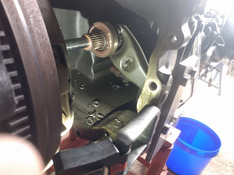 Nächstes Problem, Welle sitzt in der Verzahnung von der Schwungscheibe fest. Irgendeine Idee wie ich rausbekomme? Vollgesprüht mit Rostlöser hab ich schon und rumgerüttelt usw. Will auch nicht vielmehr nach vorne auseinanderfahren, nicht das hinten im Getriebe Zahnräder oder sonstwas runterfällt.